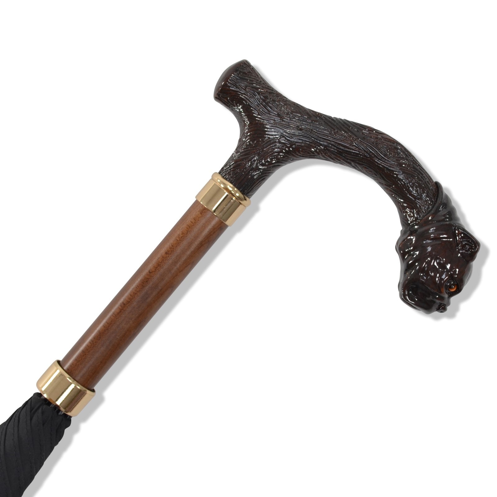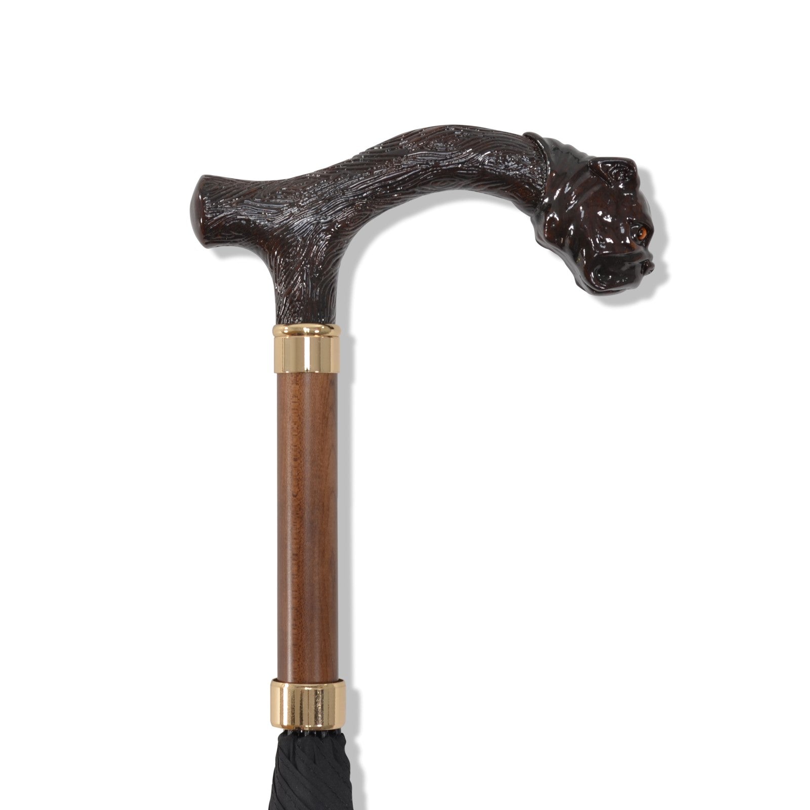 This umbrella comes with a Brown Finish Bulldog Head on a straight stem handle with Gilt Tip Cup, the umbrella is made on a 25" Classic Fox Steel Tube Frame (brown tube with black ribs) with a Best Polyester cover/canopy. This umbrella also comes with a matching outside case to help keep the umbrella clean when stored.